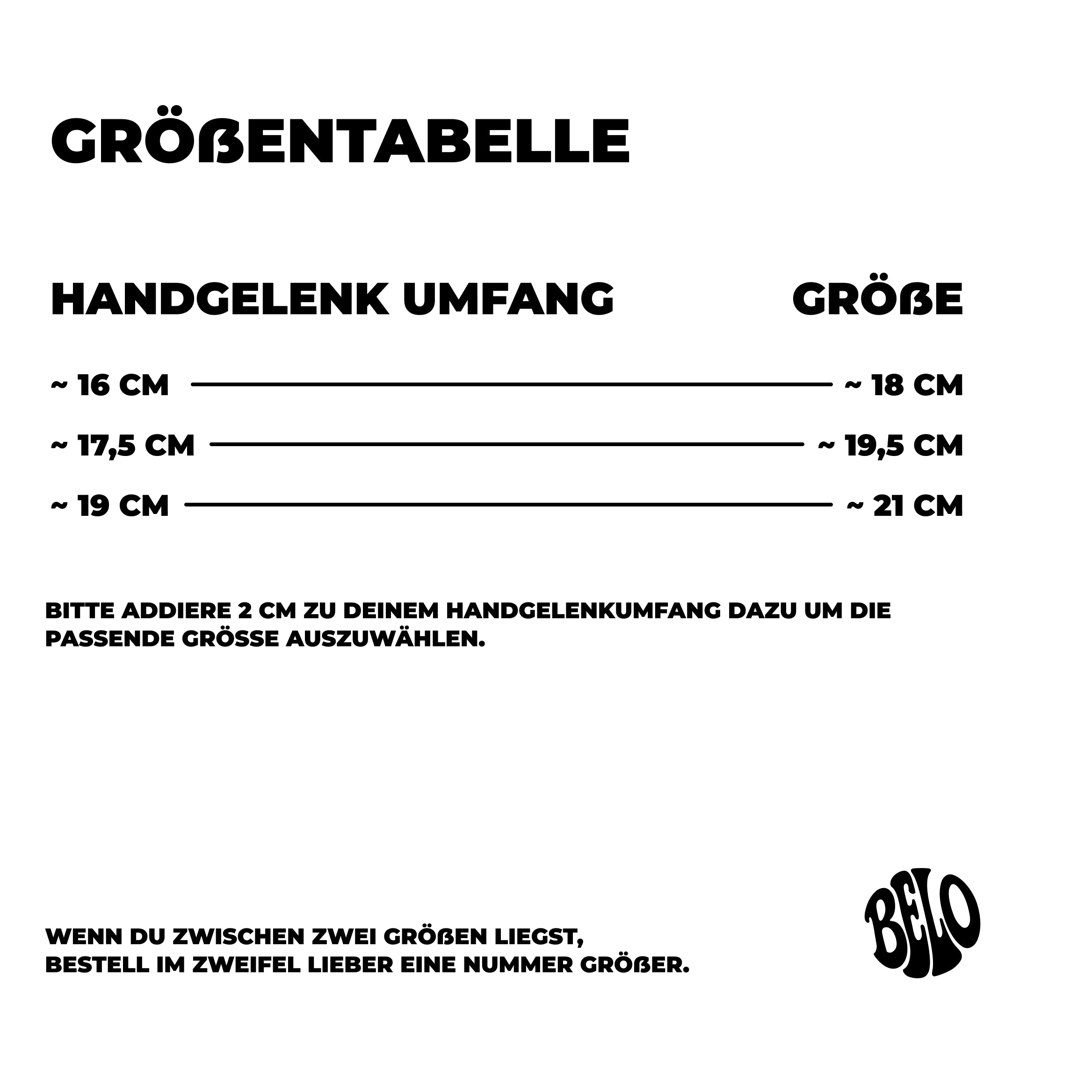 Damit du die passende Größe für dein Armband findest, haben wir unten eine Größentabelle vorbereitet.