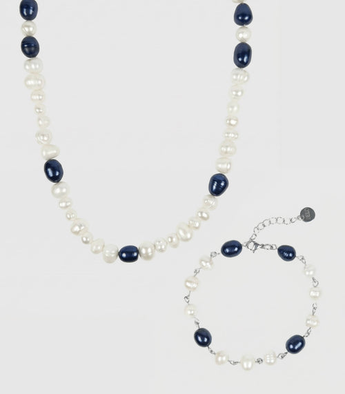Die Midnight Sky Necklace kombiniert dunkle Mitternachtsperlen mit hellen Süßwasserperlen – inspiriert vom Kontrast zwischen dem blauen Nachthimmel und leuchtenden Sternen. Handgefertigt in Wien aus echten Süßwasserperlen & Edelstahl.